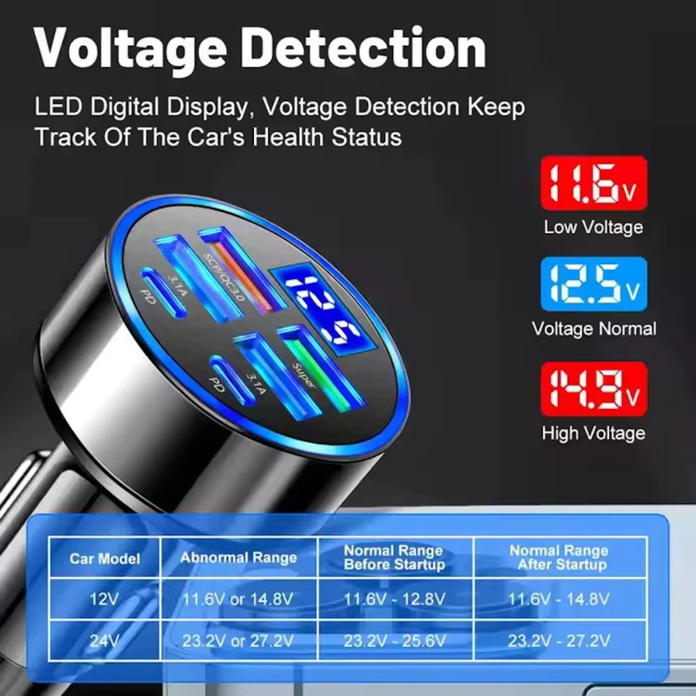 The Dynamic 6-in-1 Car Charger is a versatile USB car charger adapter designed to simultaneously charge multiple devices on the go. Equipped with dual PD fast charging ports and multiple USB outputs, it delivers rapid and efficient power to your smartphones, tablets, and other USB-powered gadgets. Compact and compatible with most vehicles, this charger ensures you stay connected and powered up during your travels.